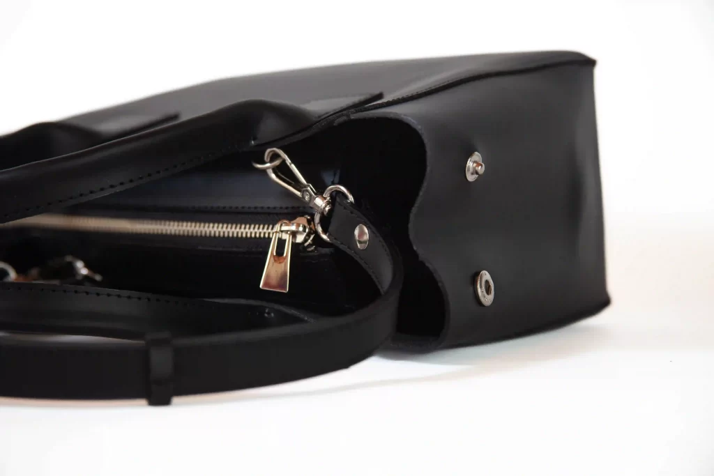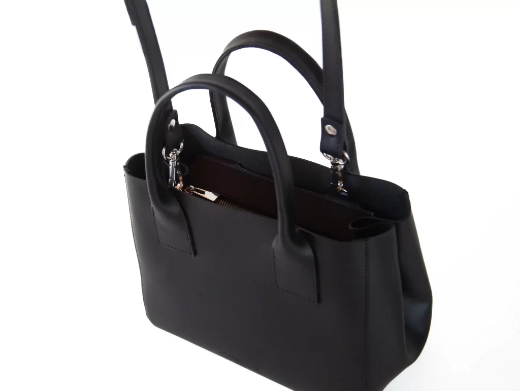 De tamaño medio, pensada para llevar en el antebrazo o cruzada como bandolera. En el acceso se cierra con cierre metálico y en los laterales puede expandirse, abriendo los broches y adoptando la forma de una tote. Viene con correa larga desmontable y herrajes de excelente calidad.